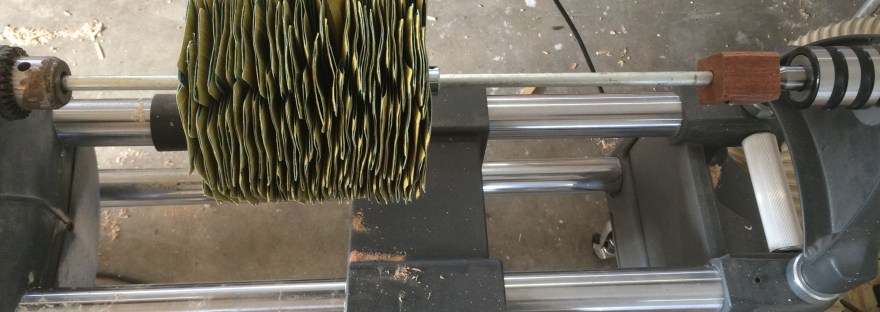 Now you are ready to chuck it up on the shop smith with your live center MT2 in the tailstock. Happy sanding! Stay tuned for the improvements I had in mind, including dust collection and an adjustable platform for molding. Finally, don’t forget to break in your sand paper with a scrap piece of wood to loosen the strips up a bit!. Wear a dust mask, and open the doors ;0)