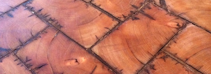 Basically an end grain floor is a beam or other wood that has been cut into slices then glued down to the subfloor. The tiles can are a bit fragile until you glue them down, once they have been “grouted” they are solid. This floor does not move in the least.