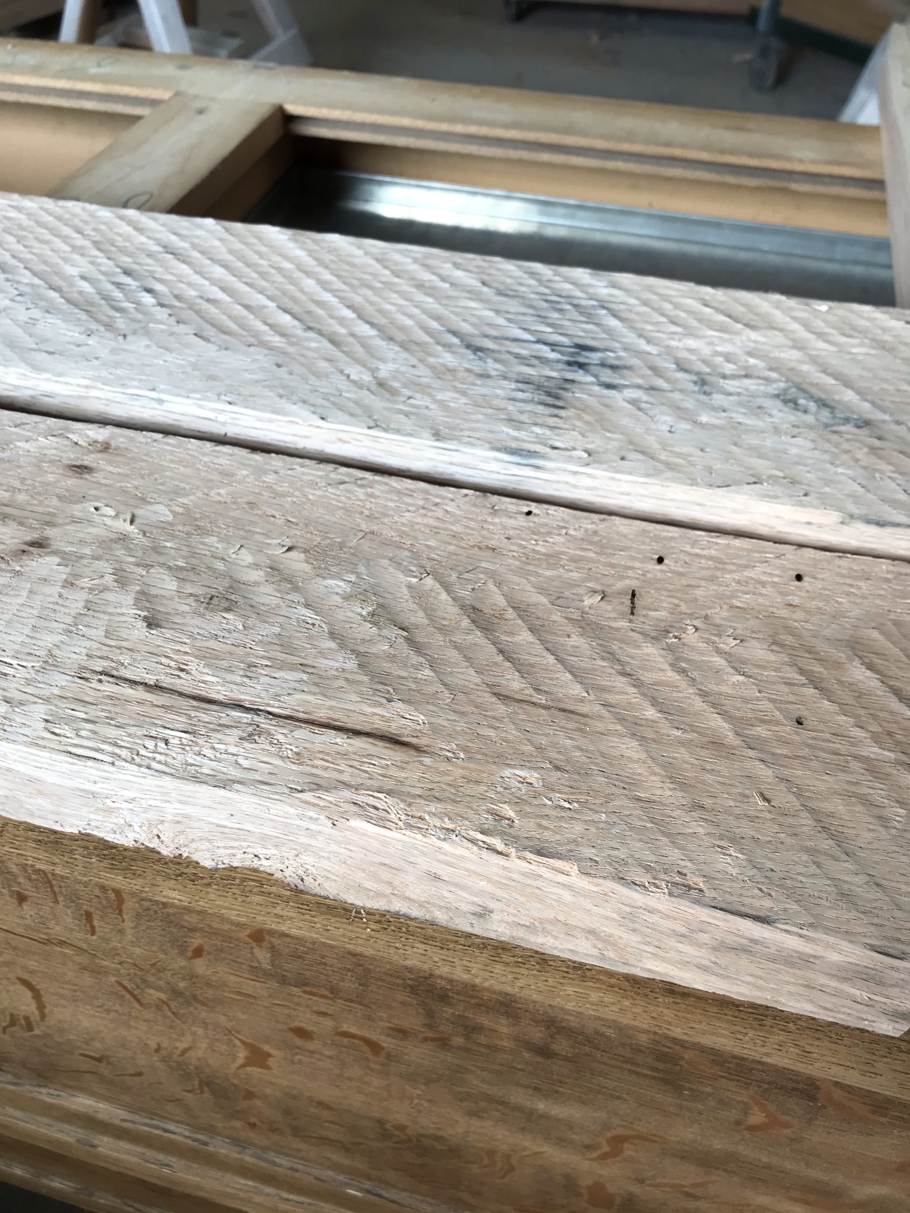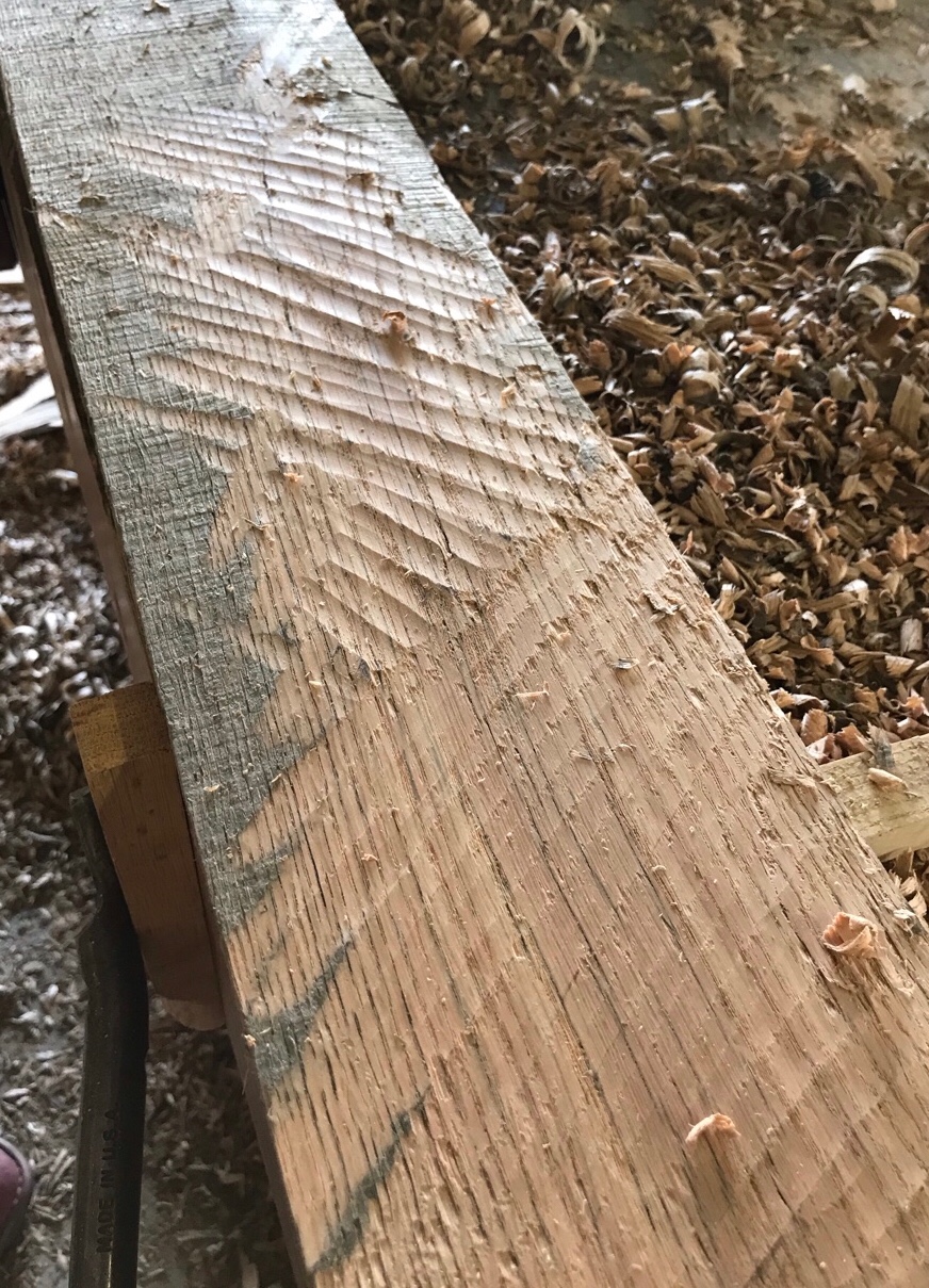 On the bottom of the board, opposite the crown, you can see that the board has cupped. In a piece of oak this thick, it might be possible to fix both of these with a power planer, but since I already needed to remove the dirty outer layer of wood, it’s just as easy to flatten as you go.