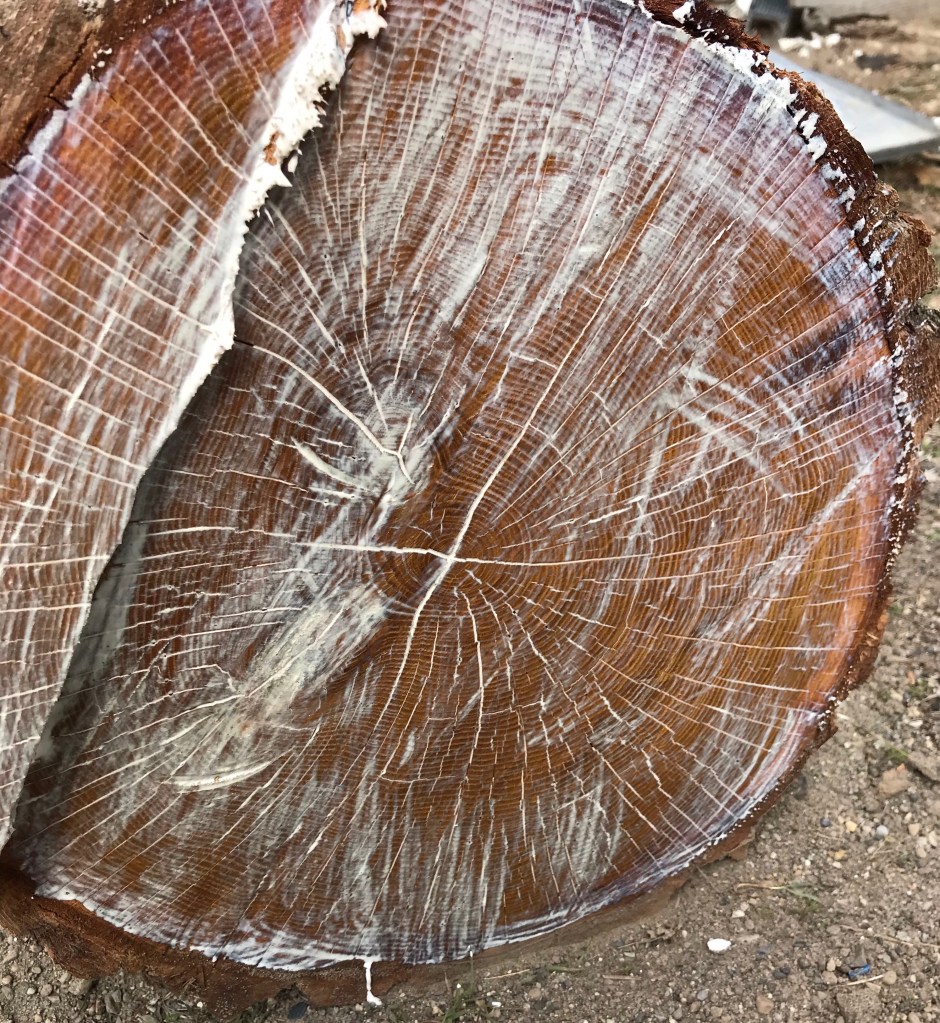 First order of business was to get the end of the logs sealed. They were cut in November and should have been sealed then, better late than never. I brushed a pretty heavy coat of Anchorseal on the ends and where the branches had been cut off. Depending on how we end up milling these heavy beasts, I may cut off the ends and seal them a second time.