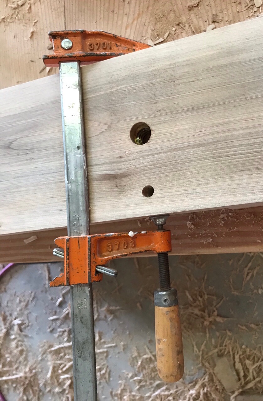 Once the pieces were cut to length, I clamped them in so I could drill a hole for the peg. This was done on the back side to hide the mechanics from the front. Not that it mattered in the end…I ended up drilling holes for bolts through the face. I’ll probably try to plug them so at least the obvious circles are wooden and flush :0)