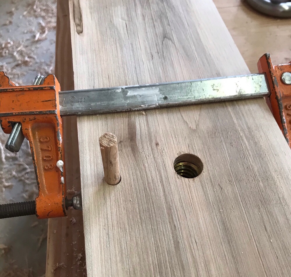 There is no glue, just pegs holding these in. If the nuts wear out this will make it easier to exchange them in the future. I precut my peg lengths, then pounded them in and this little project was done!
