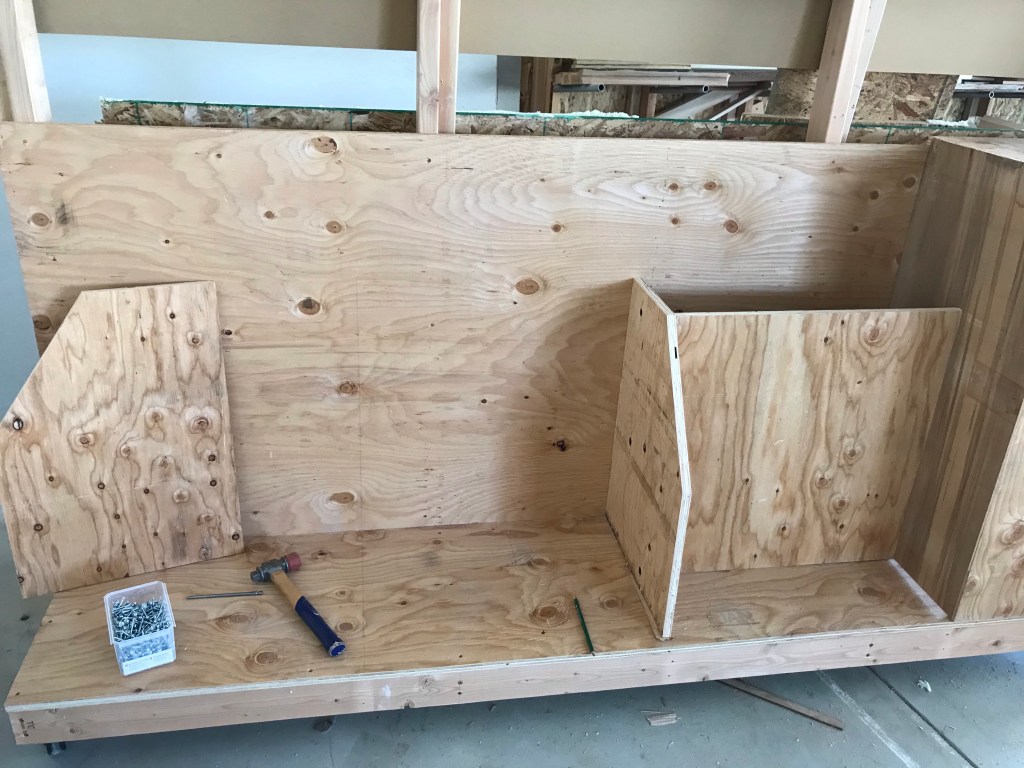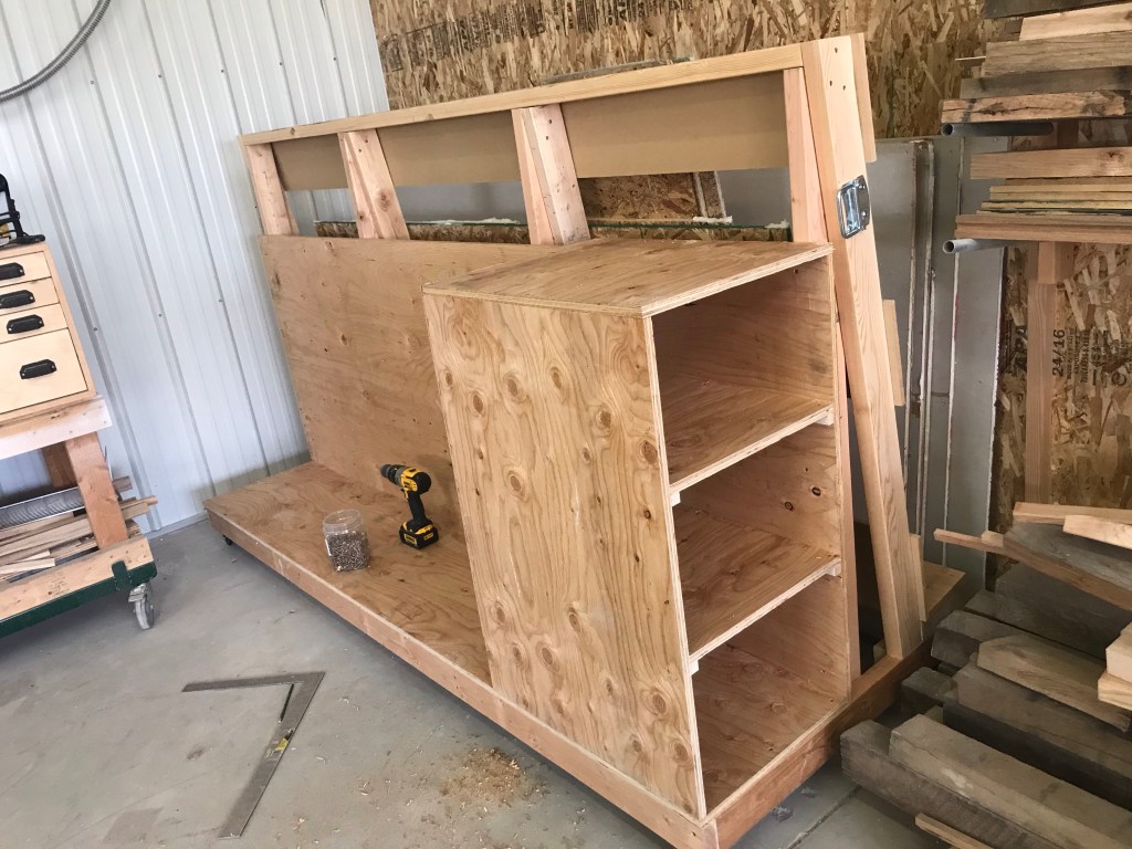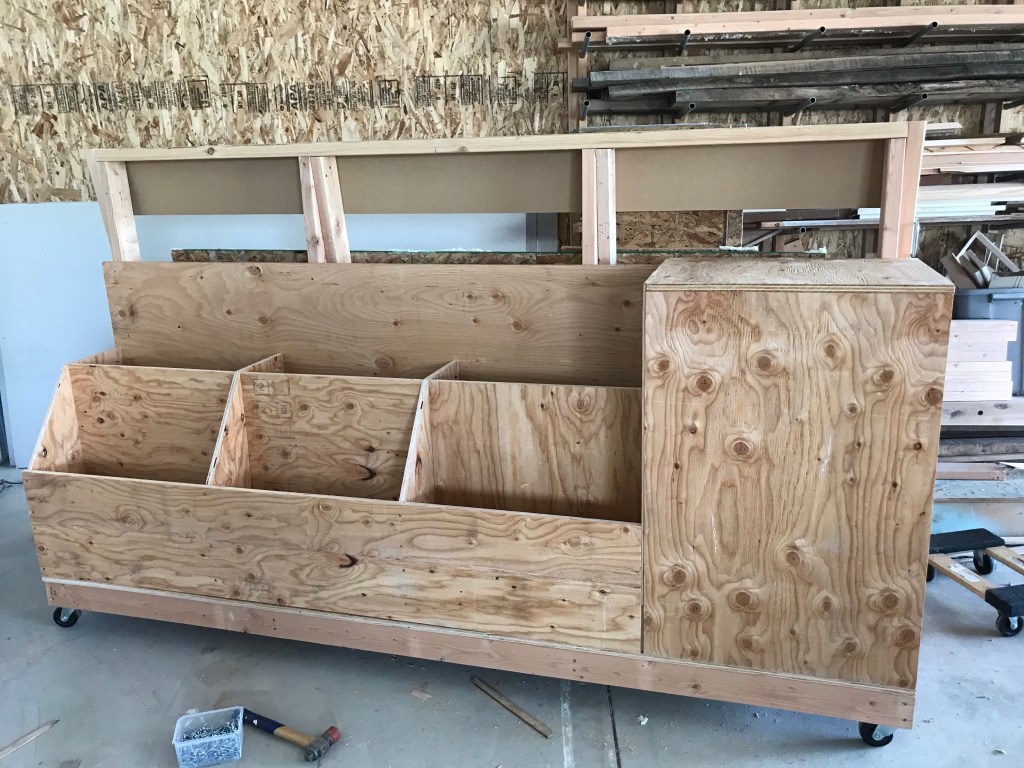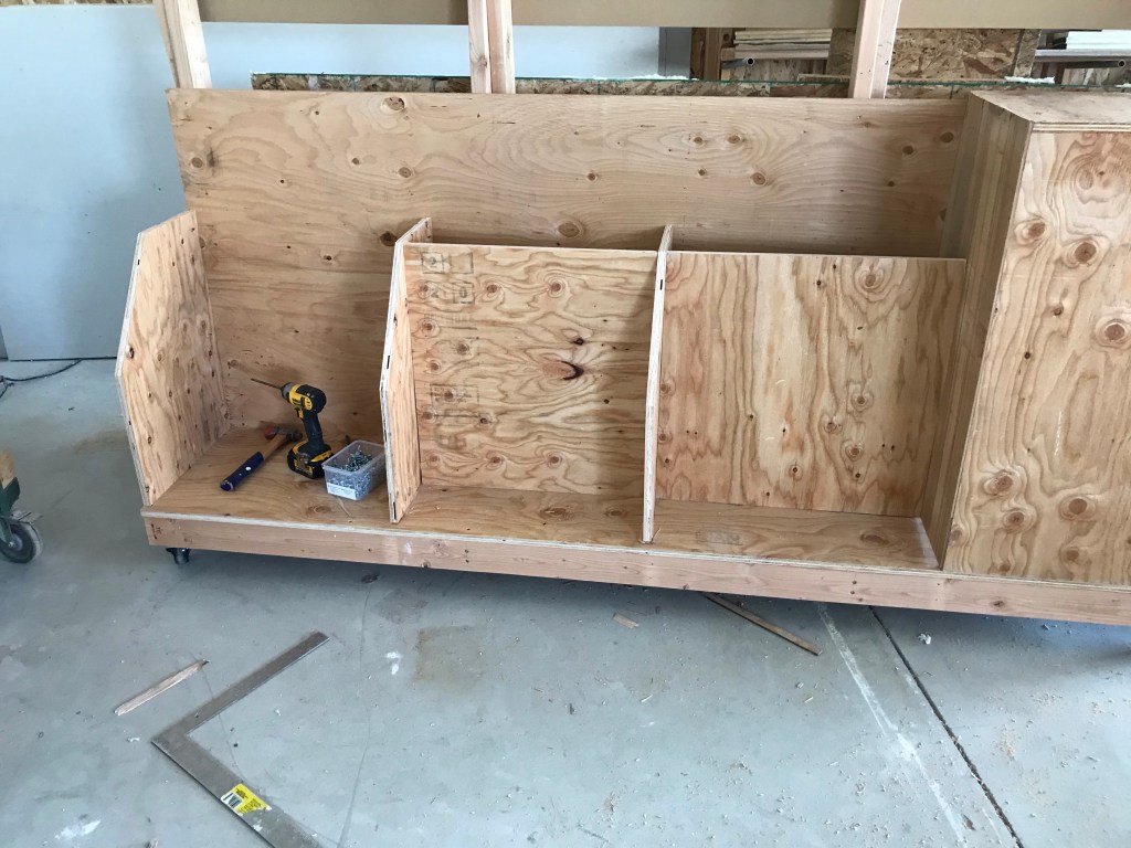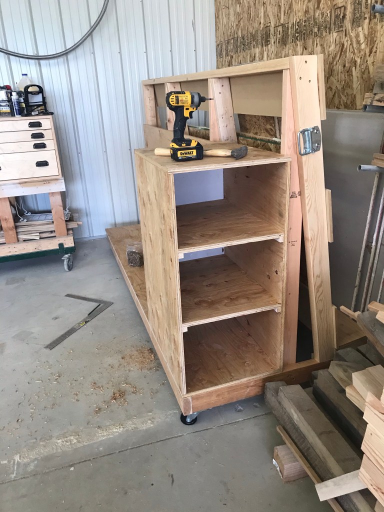 In Wood and Plywood Cart Part I I built a base and finished the plywood side of the cart, now we’re going to add some shelves and bid to the other side of the cart. First I covered the bottom and 3’ of the back with plywood.
