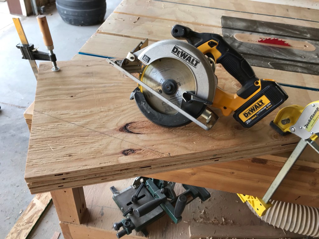 To save plywood I didn’t have the slope go all the way to the top of the back. Also I didn’t have a full 8 foot piece big enough for the front so I used two smaller strips that ended up being close to 12” when stacked on each other, so their combined measurement was the front of my slope. I stacked them together and cut them with the circular saw.