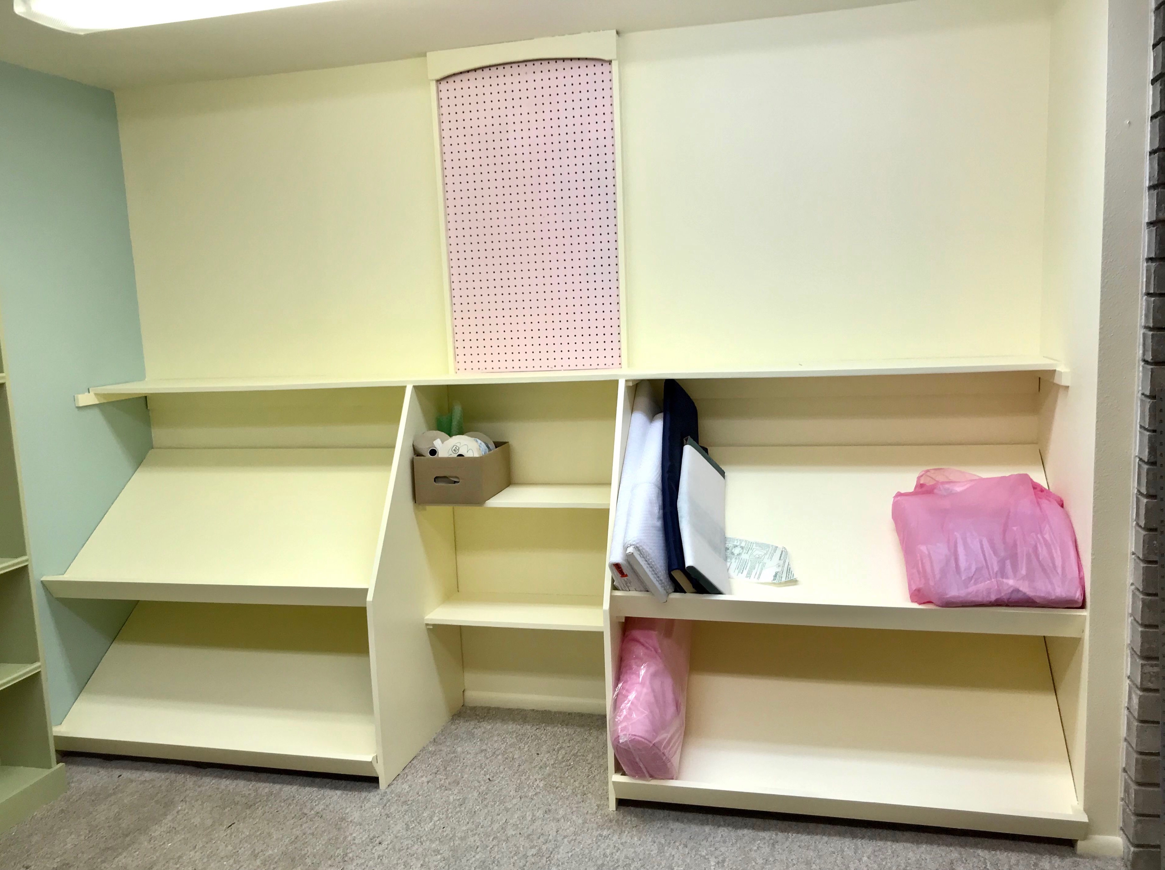 Last time in Part I of Mom’s Quilt shop I had built her some shelving to store her fabric on, but needed to come back home before I could finish it for her. Wes stayed to help out and they puttied, sanded, primed and painted everything they could and organized piles of stuff.