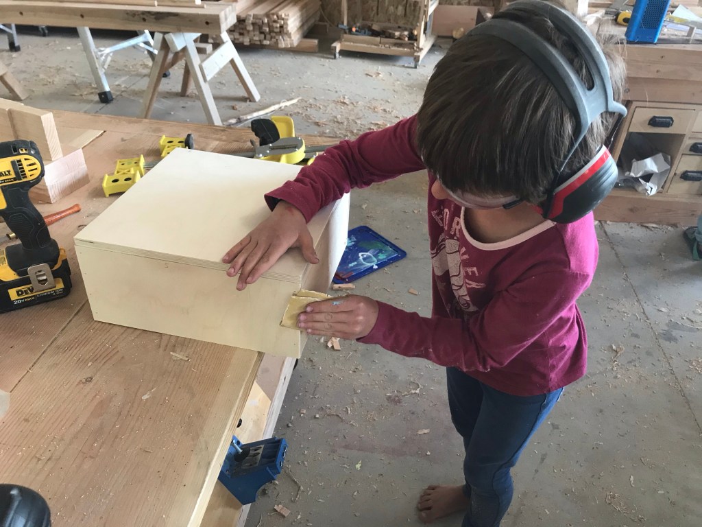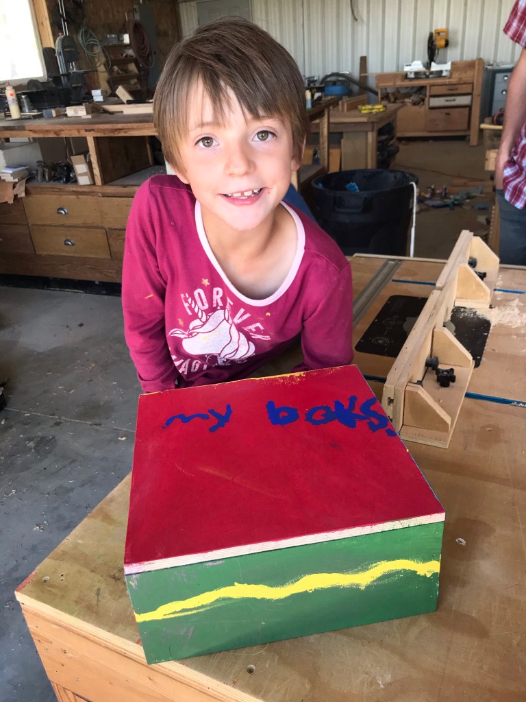 Not long after Mary came out to build her Tool box Cora wandered out to the shop and wanted to build something too. Her idea was a little different though ;0). She wanted a box with a hinged lid. I always save the hinges when I take them off things…but the kids are gaining on my stash…