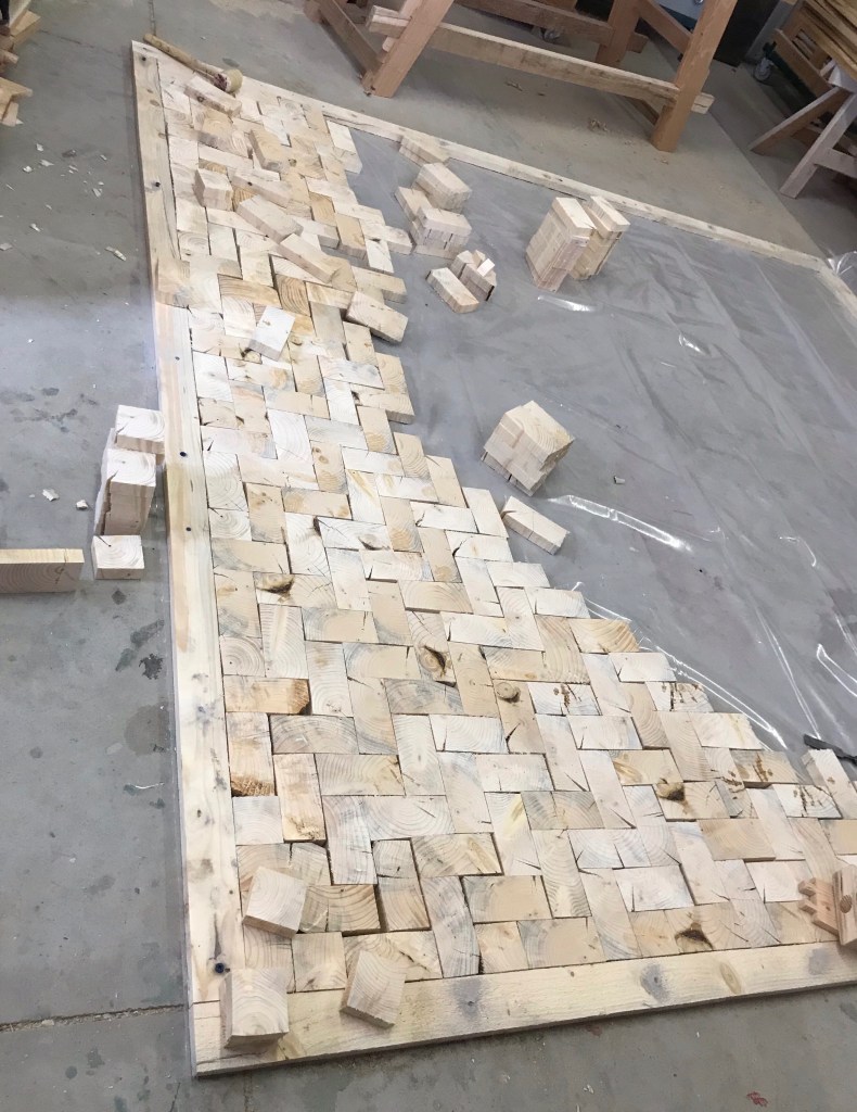 Herringbone is my favorite brick pattern, so that’s what I started with. For a while it seemed to be going just fine…then the discrepancies in the size of the beams started to really show up…by the end of the square I was just trying to get them in to fill the space.