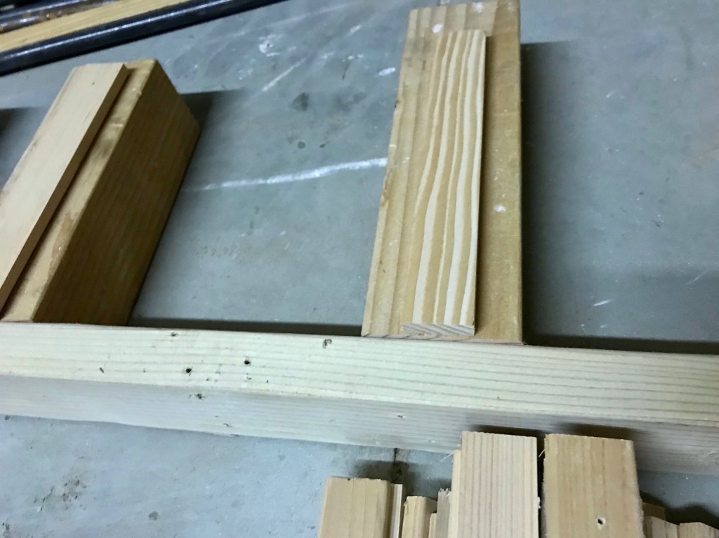 In the shop the first thing I did was cut a pile of 1/2” stickers 9-1/2” long, then cut some 4×4’s down to 10” to start the stack on. After picking a spot on the floor close to the wood rack, I laid out my base using a 2×4 to line everything up.