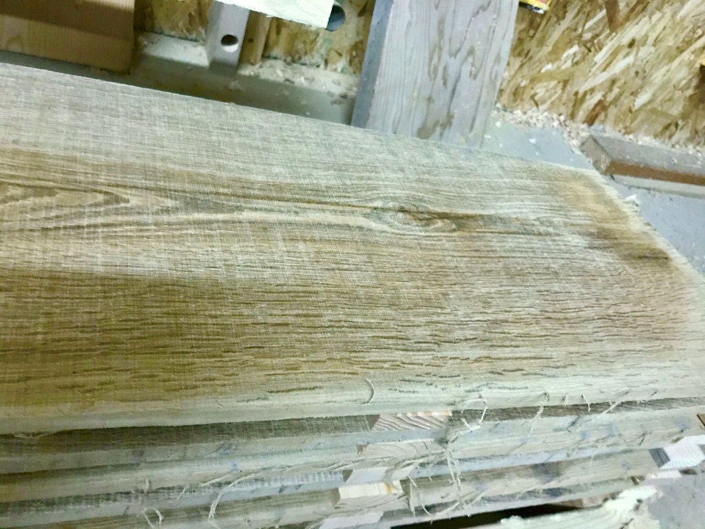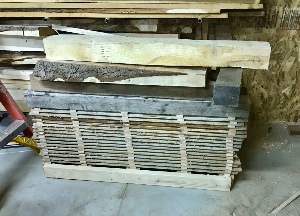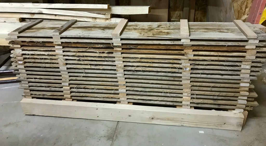 Once I had them all stacked, I looked around for something heavy enough to weigh them down. Dunnage wood seemed like a good option, so I picked a couple of rough looking oak 4×4’s from off the rack and cut them to 4’ lengths and stacked them on top.