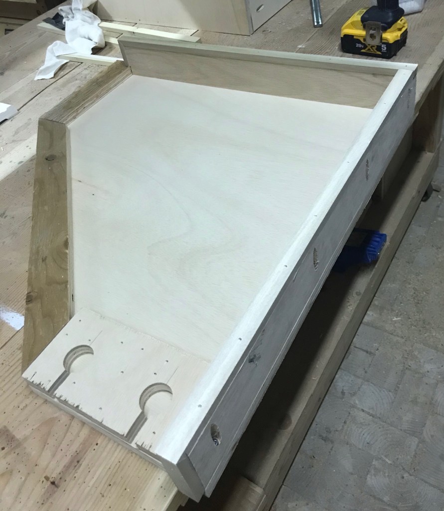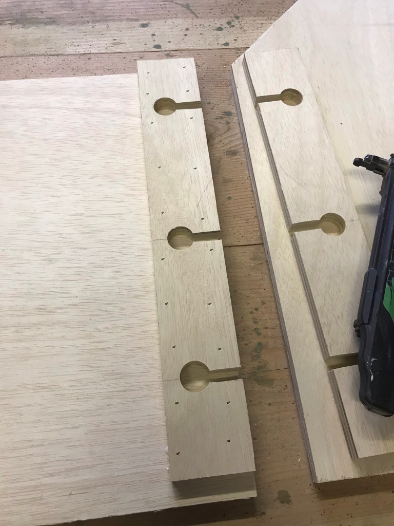 I tried to plan ahead a bit assembling the desk tops :0). It almost worked, when I went to install them there was one or two things that didn’t quite work out. Rather than try to use a router to make the connecting line for the anchor bolts like I did on the Moxen Vice work station, I decided to cut everything out the easy way before gluing and nailing it down.