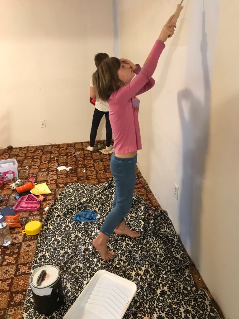 Since this made the desk I designed for them to share a little obsolete, I rethought my entire plan. Instead of building a wall, I moved Mary’s furniture around to create a wall and changed the location of her desk. This exposed the ugliest wall in the house which now needed to be painted. The original owners had painted around a sort of built in cabinet thing and the wall was two toned dirty primer and white in an odd shape.