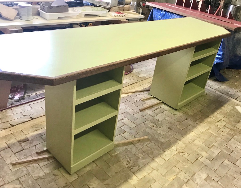 In the original plan there was going to be two 6’ counter tops with a corner piece between them. Identical shelving units on either end and a couple of corner shelves above the desk.
