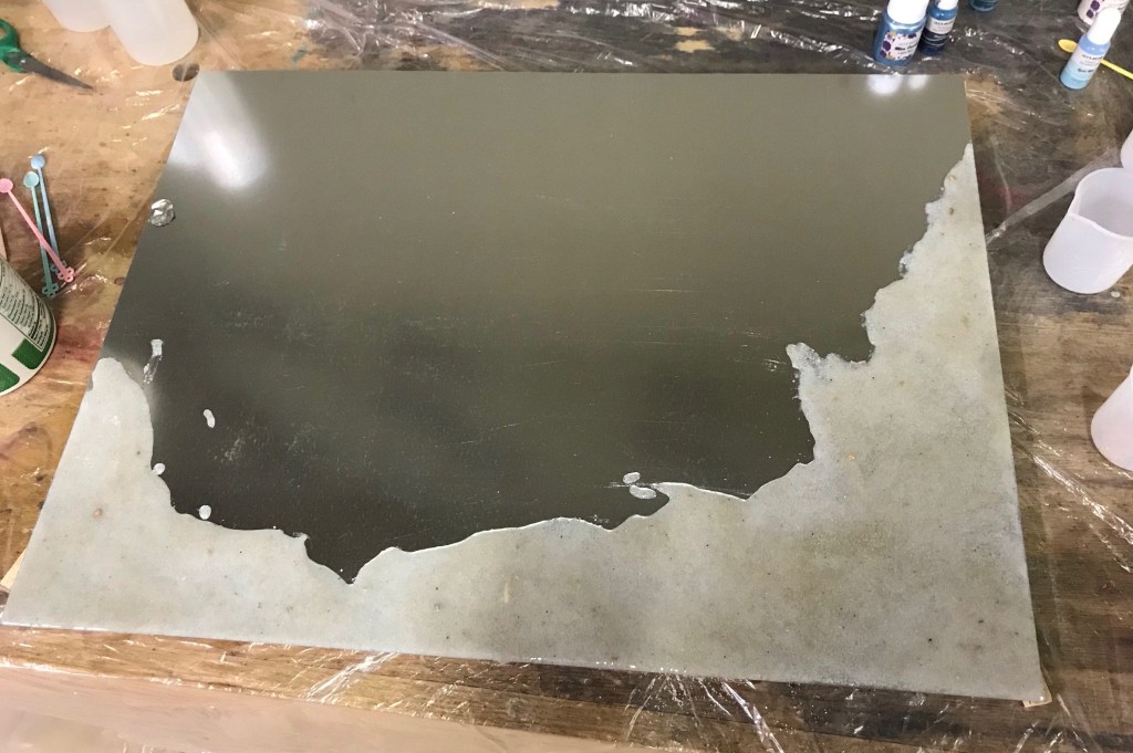 Third mistake: I had propped my sheet metal on a few sticks for support to keep it off the work bench. When heated up, the metal buckled and my resin started to pour off the corners. Whoops! For later projects I cut a piece of OSB slightly smaller than my metal to better support it.