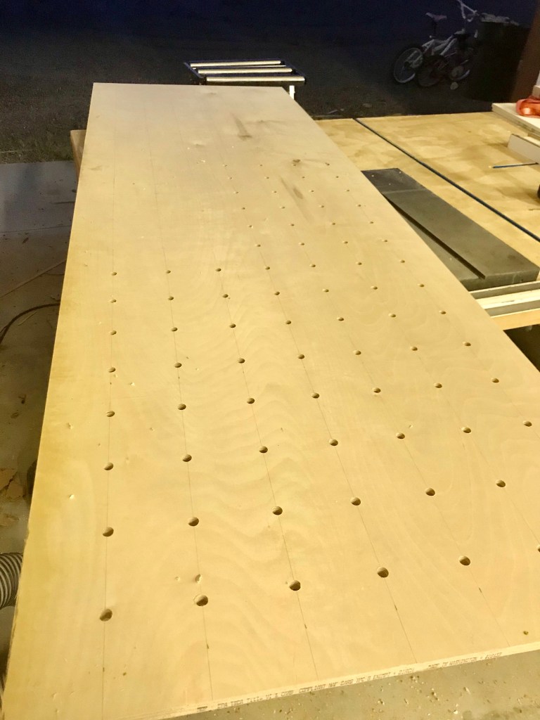 One of the first things I did after coming home with a huge pile of lumber was to lay out the climbing wall. I chose to do a 4” grid and drilled a 1/2” hole at every cross point. The hand holds attach to T-nuts which we pounded in the back…in every other hole since I didn’t order enough to go in every hole. This way the climbing wall can be rearranged without taking it back down.