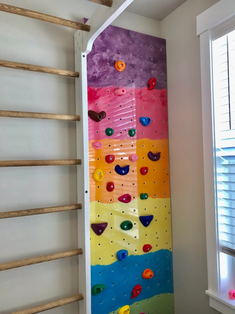 The last thing I did before packing up and hauling these projects 200 miles was to use some countertop epoxy on B’s climbing wall so I could add some color to the project since the paint was going to be white for both of them. In my head this rainbow was going to be a lot more artistic and look like a grassy hill with a sunset, instead we have stripes. Oh well ;0)
