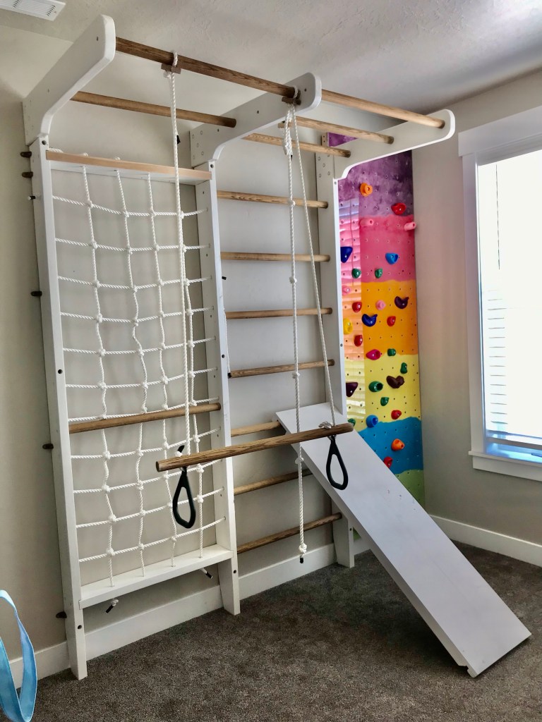 I built a frame of 2×2’s with two cross pieces to put behind the climbing wall. This we anchored to studs with 3” screws, and to the adjacent upright. Once we had the frame in place we attached the climbing wall with pan head pocket-hole screws along the frame. I predrilled all of the holes beforehand to eliminate any guesswork.