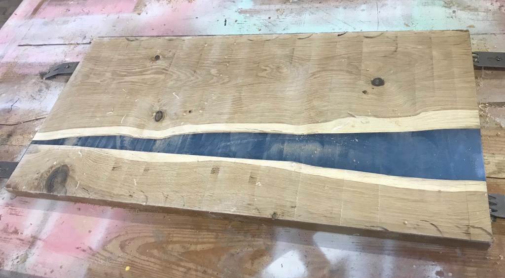 Earlier this summer I decided to try making a River table for Jared out of some of the Burr oak slabs I left live edges on…it was a bit of an adventure to say the least ;0). But did work eventually. Once the epoxy decided it would in fact cure, I had tons of cleanup to deal with.