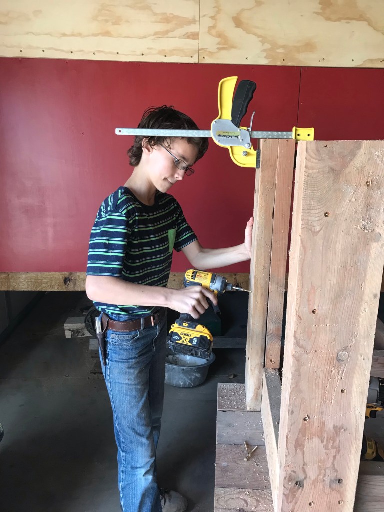 Given the choice, Wes decided that cutting boards to length was more up his alley than screwing the cut pieces together. He’s getting pretty good with the miter saw.