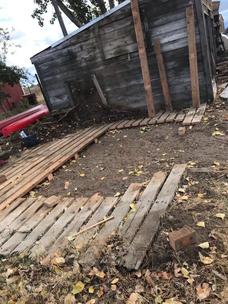It took some serious muscle to get the 2×6’s pried loose from the runners. It was built using 5” nails and they weren’t giving up their place easily! And it took a few tries to come up with a system that worked. It involved a sledge hammer and a crow bar…
