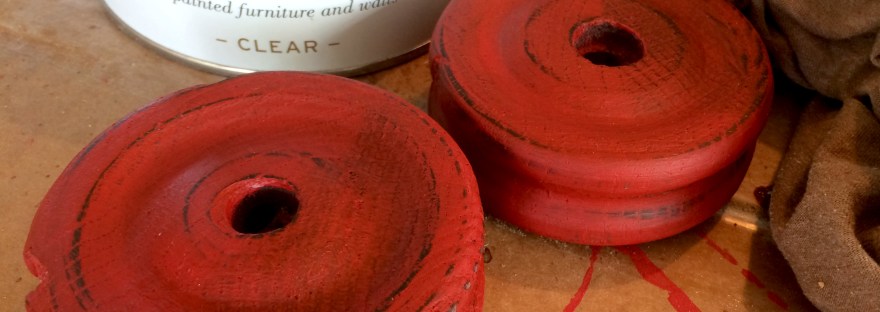 This post might more accurately be named: Wooden Pulley Wheels take 2 & 3. I had just gotten two done, started painting them when I realized there was something wrong and they were not going to work :0/